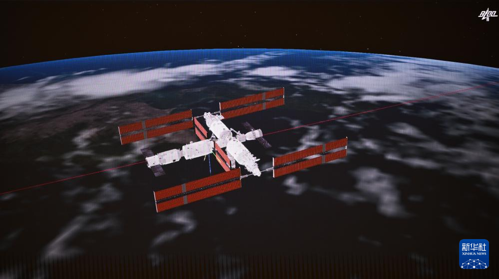 这是4月26日在北京航天飞行控制中心拍摄的成功对接后的神舟十八号载人飞船和空间站组合体的模拟画面。