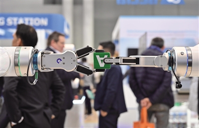 在近日举行的2024年德国汉诺威工业博览会上,人工智能成为重点关注的领域之一。图为会上一款机器人在演示传递物品。新华社记者 任鹏飞 摄