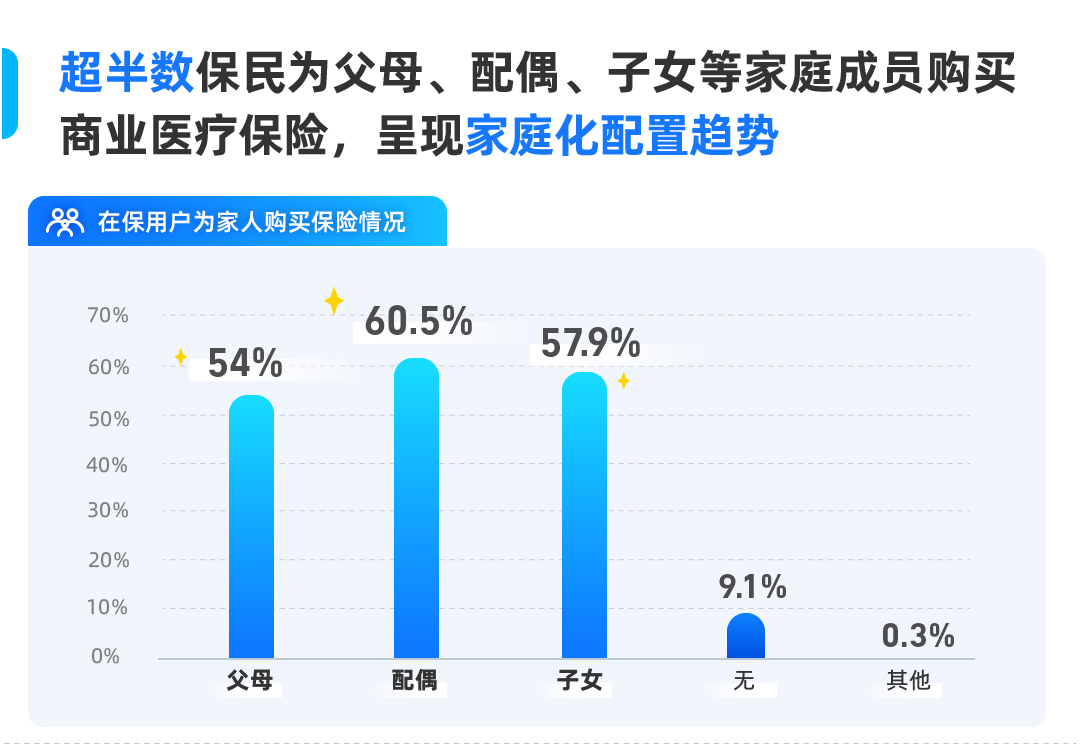 5月20日,《中国商业医疗险发展研究蓝皮书》(以下简称《蓝皮书》)在京发布。《蓝皮书》显示,随着人口结构变化以及健康观念普及,消费者的保险意识逐渐提升,超半数购买了商业医疗险的保民也会为父母、配偶、子女等家庭成员投保,呈现家庭化配置趋势。与此同时,年轻群体对商业医疗保险的满意度超过70%,并普遍打算长期参保。
