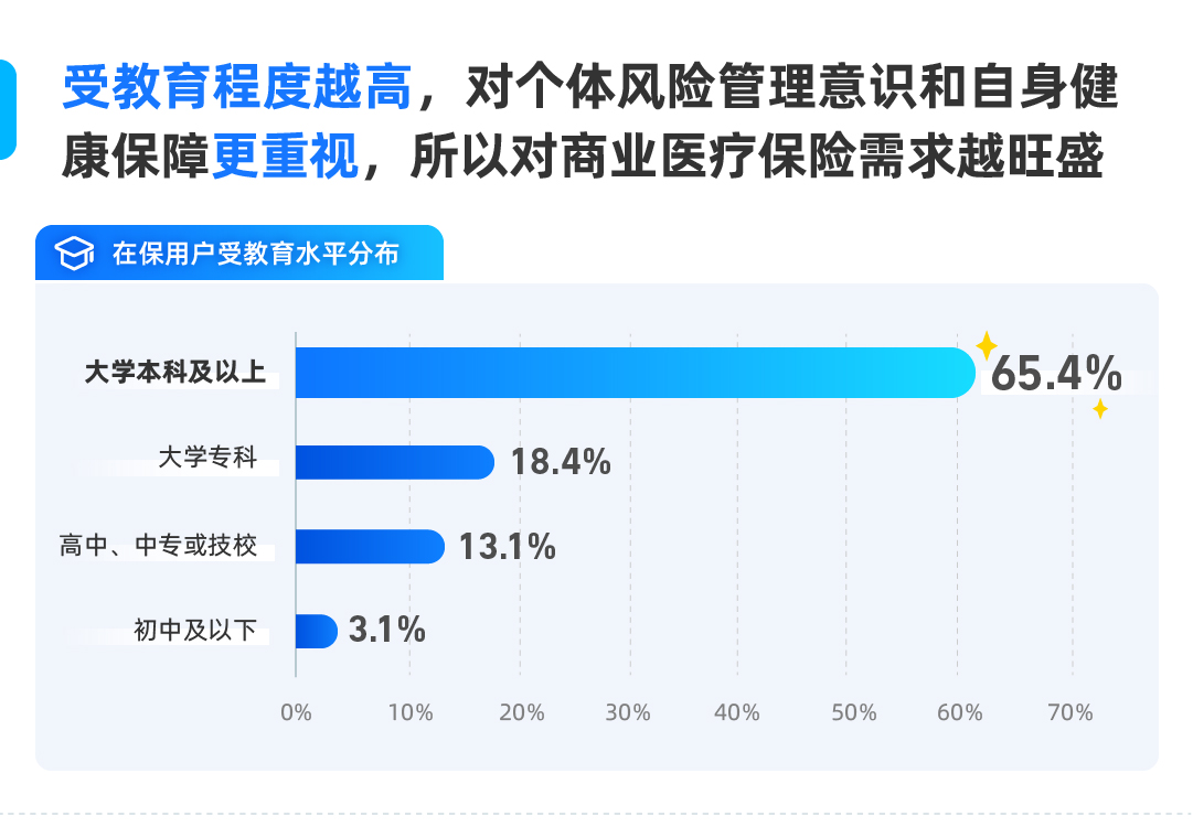 《蓝皮书》由南开大学、人保健康共同调研和撰写,通过蚂蚁保平台的样本数据分析结合线上线下问卷调研的方式,刻画了当下保险消费者的投保特点和趋势。《蓝皮书》的调研数据显示,在已购买商业医疗保险的人群中,大学本科以上学历占比超过65%,因为受教育程度越高的群体,对个体风险管理和健康保障越重视,所以对商业医疗保险需求越旺盛。另外,已婚人群的家庭观念更强,且更重视未来规划和风险管理,因此更愿意购买医疗保险,已婚人群占比达到77%。