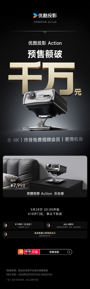 好产品终会得到市场认可。据悉,优酷投影Action预售期5日,便突破千万销售额,获得消费市场高度认可。相信不久的将来,这款“最懂用户”的投影仪艺术品,将走进更多家庭,成为更多用户享受家庭娱乐时光的伴侣。