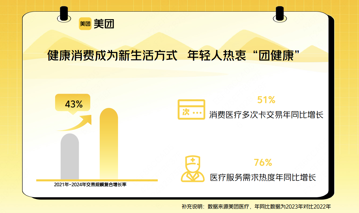 持续涌现的健康需求,正在成为消费增长的“新引擎”。据美团数据,从2021年至2024年,平台上消费医疗的交易规模复合增长率达到43%,二次及以上团购的多次卡交易增速达到51%。