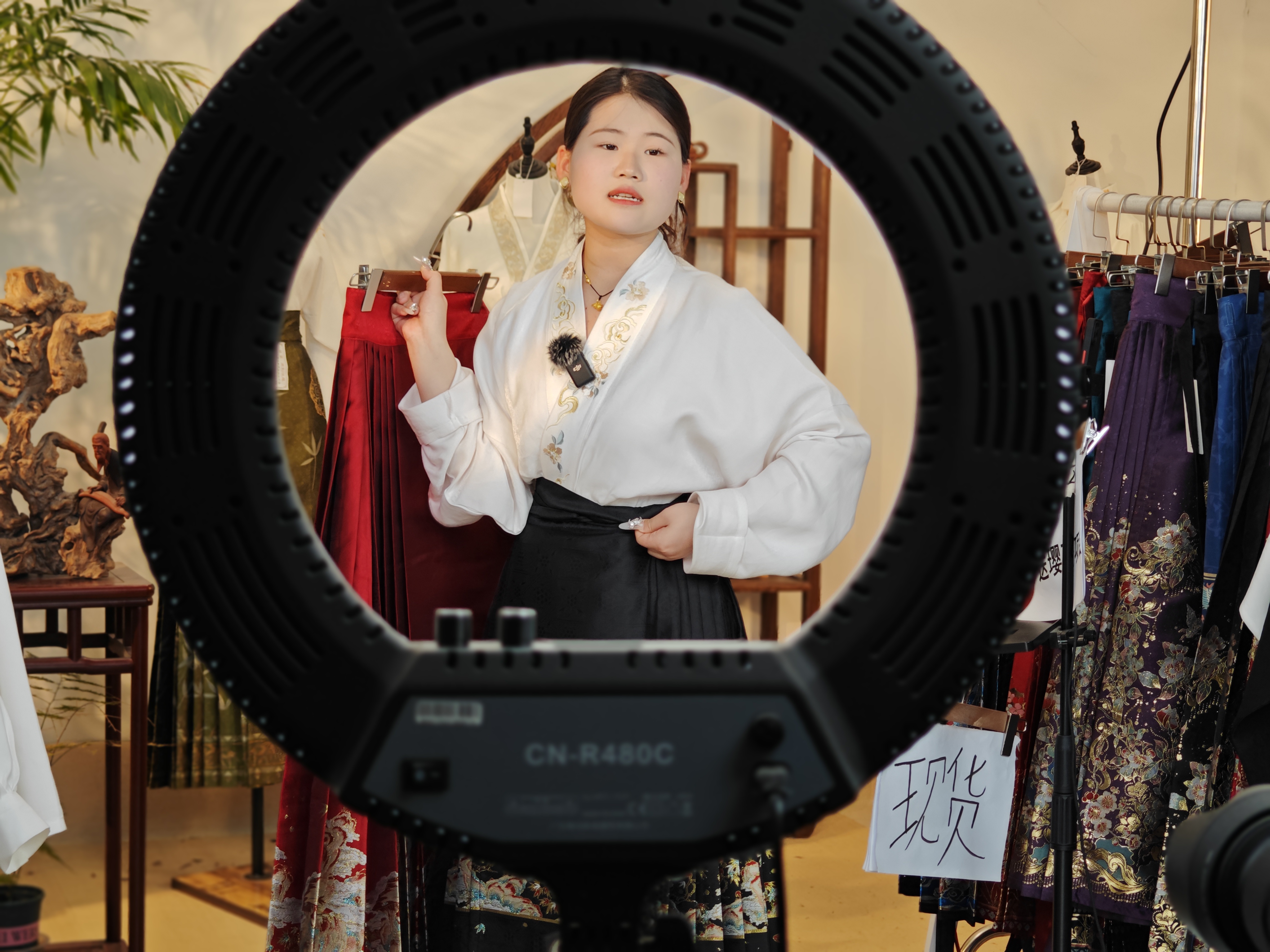 “以前网友们说‘北上广曹’略带戏谑,而今这里俨然是国潮崛起的典型代表。”在曹县的爱云仓直播基地,汉服展厅内陈列着从唐代到明代等各个历史时期的中国传统服饰,周边环绕着一间间忙碌的直播间,短短半小时内,展厅内便迎来了众多参观和询价的访客,而这仅是曹县汉服产业繁荣景象的冰山一角。