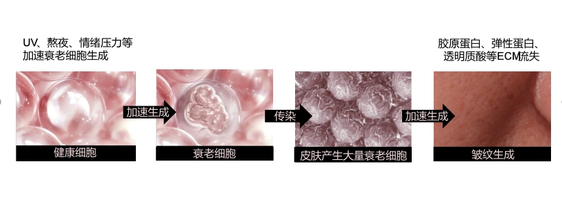 从细胞学角度来说,衰老细胞自身由于DNA损伤,将会出现细胞周期停滞的情况,不仅如此,衰老细胞还会分泌衰老相关分泌表型(SASP),例如促炎细胞因子、金属蛋白酶等,就像一个坏掉的桃子,对周围的健康细胞造成传染性的影响。前空军总医院皮肤病医院院长、皮肤科主任刘玮也表示,“除了细胞学的角度,衰老细胞带来的分子学表现可能更贴近大家的感受:它通过SASP导致细胞外基质的流失,例如大家熟知的胶原蛋白、弹性蛋白、基底膜蛋白等,导致皱纹、皮肤的松弛等老化现象。”