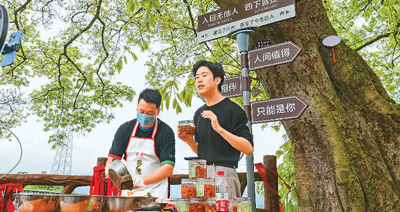 在重庆市綦江区赶水镇石房村,主播在进行直播带货,助农销售当地特产草蔸萝卜干。陈星宇摄(人民视觉)