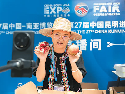 在云南省昆明市举办的第七届中国-南亚博览会上,网络主播正在推介农产品。新华社记者 陈欣波摄