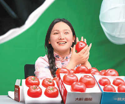 在河南省洛阳市伊滨区寇店镇孙窑社区电商助农直播基地,主播正在屏幕前热情地向网友们介绍番茄。倪 睿摄(人民视觉)
