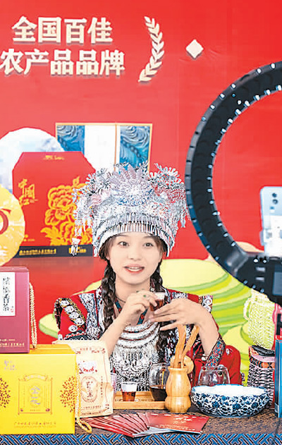 在广西壮族自治区梧州市六堡茶城,主播在电商助农直播大赛上“打擂”。何华文摄(人民视觉)