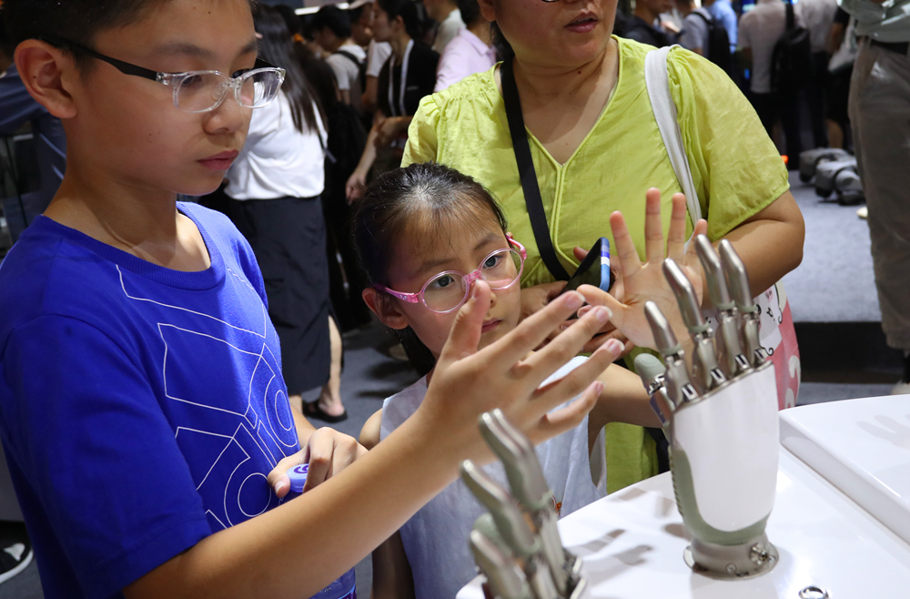 7月5日,在2024世界人工智能大会,小朋友在傲意科技机器人灵巧手展品旁参观。新华社记者 方喆 摄