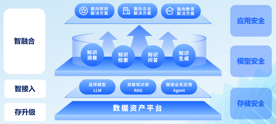 智融合:融合100多个智能应用场景,充分利用大模型的能力,实现智能化知识洞察、知识检索、知识问答、知识生成,打造数字员工,辅助智能办公。
