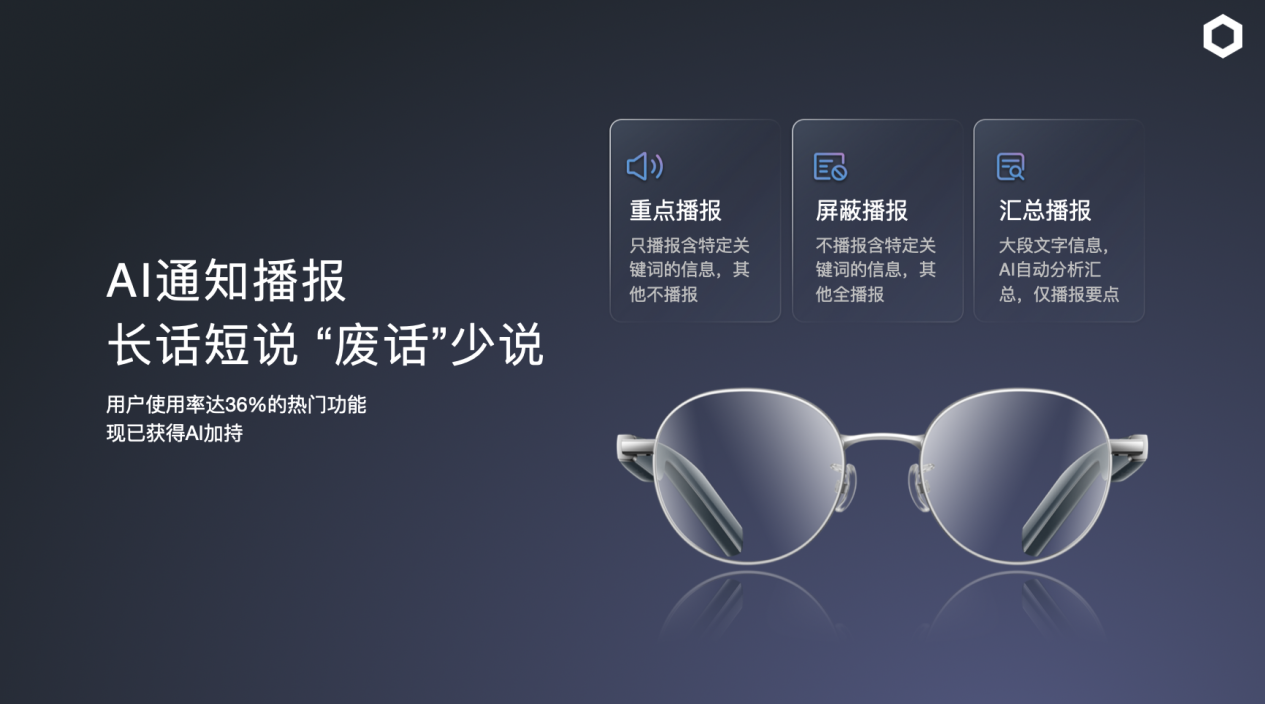 AI通知播报是界环AI音频眼镜推出的一个功能。界环AI音频眼镜的通知播报功能可以实现重点播报、屏蔽播报和汇总播报,做到长话短说,“废话”少说,可实现信息的全天高效、智能提醒,让界环 AI 音频眼镜成为了信息的即时传达者,使用户不再需要频繁查看手机或其他设备,生活和工作更加高效便捷。