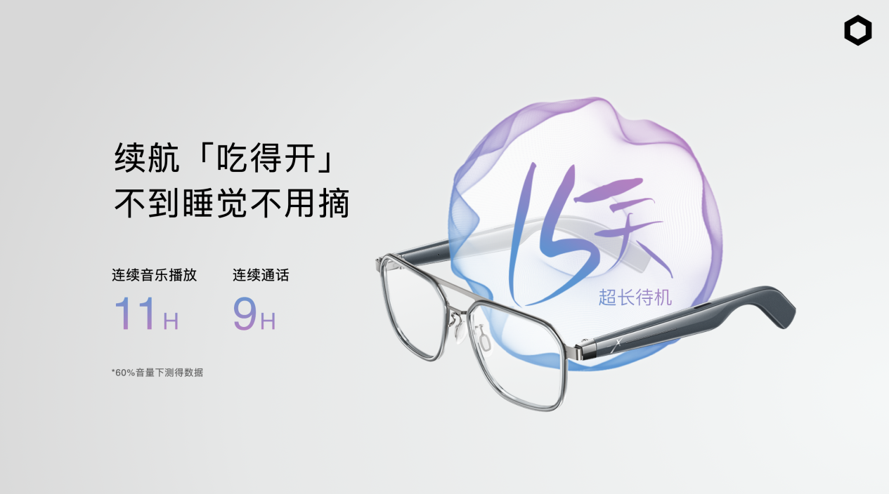 作为一款需要全天候佩戴的产品,续航能力直接影响到用户的使用体验。界环AI音频眼镜在满电状态下,可实现15天超长待机,在60%音量下实现11小时视频观看、9 小时连续通话,轻松应对日常的听音、娱乐和通话的需求,无论是出差旅行还是日常使用,都不用担心电量不足的问题,彻底摆脱电量焦虑。