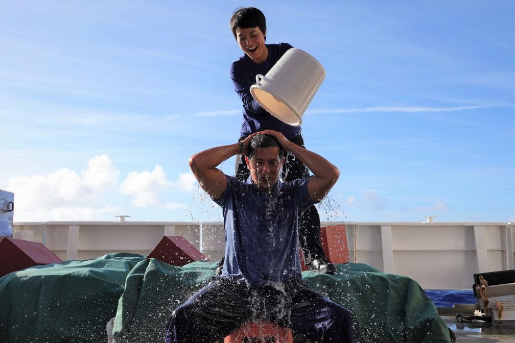 8月19日,哥伦比亚科学家海梅·安德烈斯完成下潜后,接受潜航员赵晟娅的泼水庆祝。