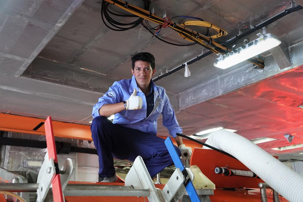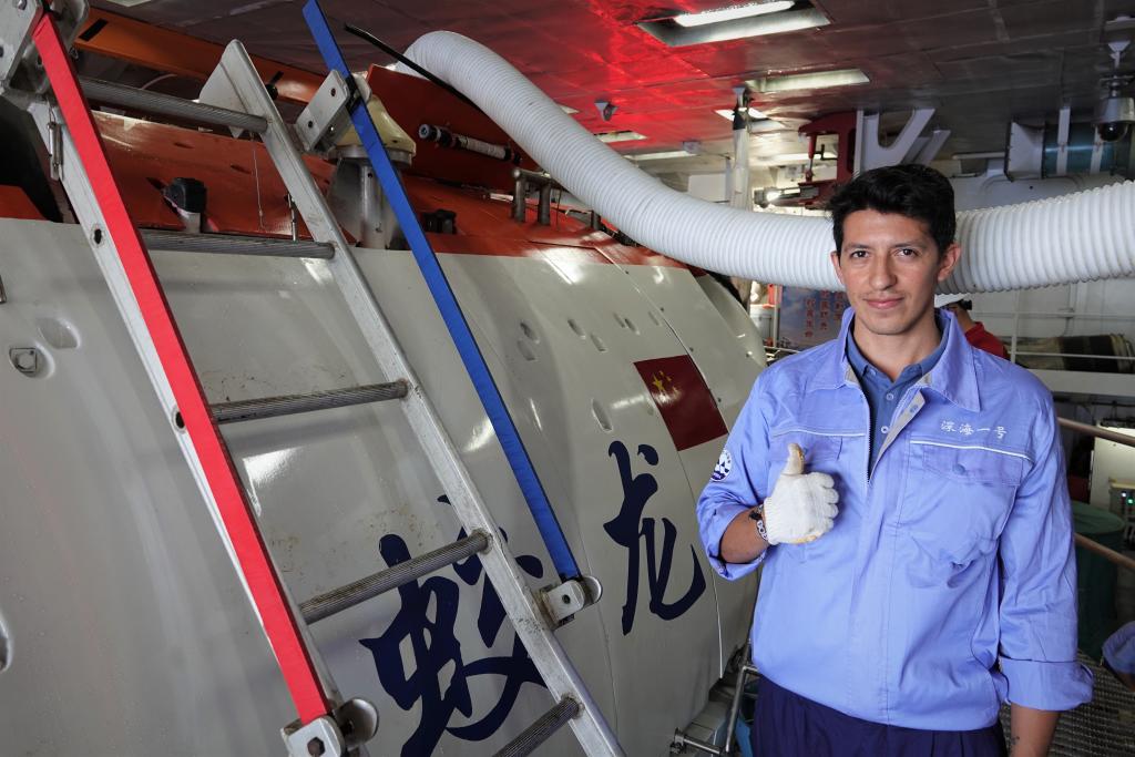 8月19日,哥伦比亚科学家海梅·安德烈斯准备进舱,参与“蛟龙号”下潜作业。