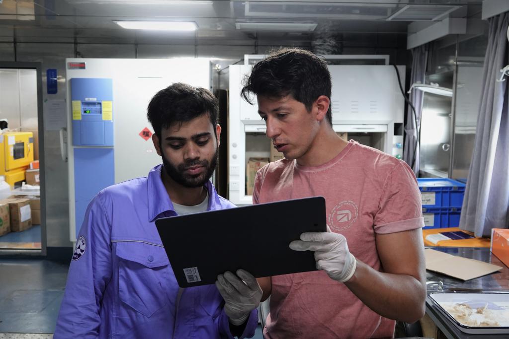 8月19日,哥伦比亚科学家海梅·安德烈斯(右)完成下潜后,与孟加拉国科学家阿卜杜勒·卡里姆在船上实验室交流深海生物样品采集情况。