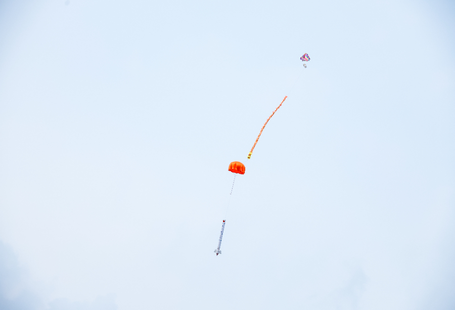 参与表演赛的“自制火箭”,有的用废弃塑料瓶制作,有的箭体上涂装了非遗剪纸作品,也有降落伞上印有少数民族特色花纹,还有喷射淀粉的水晶胆气动火箭……这些造型、材质各异,具有设计和技术创意的“自制火箭”,在“五四三二一”的倒数声中升空。