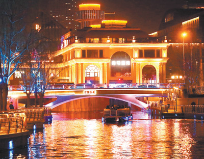 在亮马河国际风情水岸,从燕莎码头出发,途经友谊桥、铂宫船闸、琉璃桥等创意景点,缤纷绚烂的灯光秀增添了诗情画意,让人们体验“科技+文化”的魅力。“途经好运桥下的‘星空’,灯光营造的夜空星辰氛围感十足。”来自天津的游客马丽说。