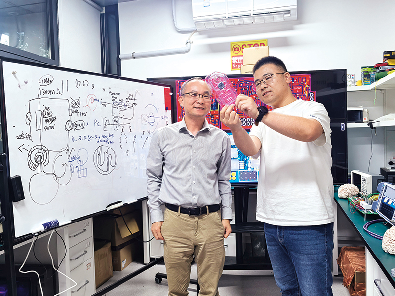 罗敏敏(左)和芯智达张垒博士在讨论“北脑一号”无线植入脑机系统的最新发展情况(2024年9月摄) 受访者供图