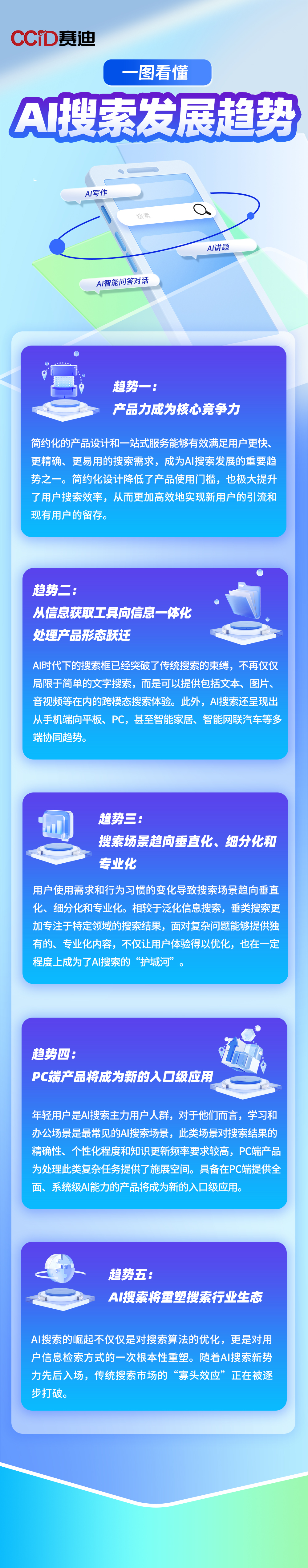 随着生成式AI技术创新的爆发,搜索引擎正经历一场革命。近日,赛迪研究院发布《AI搜索行业发展报告》(以下简称“《报告》”),提出AI搜索行业五大发展趋势。其中,简约化产品设计、一站式服务和多端一体能力迎来爆发,搜索场景趋向垂直化、专业化,具备系统级AI能力的PC端产品有望成为入口级应用,夸克等AI搜索新势力正在重塑搜索行业生态。