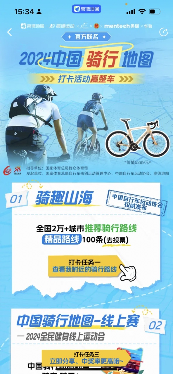 近日,在国家体育总局群众体育司指导下,国家体育总局自行车击剑运动管理中心、中国自行车运动协会联合高德地图,共同推出中国骑行地图,同时公布了2024年中国骑行地图百余条精品路线,用户在高德地图上搜索“中国骑行地图”即可查看身边的精品骑行地图,一键骑行。
