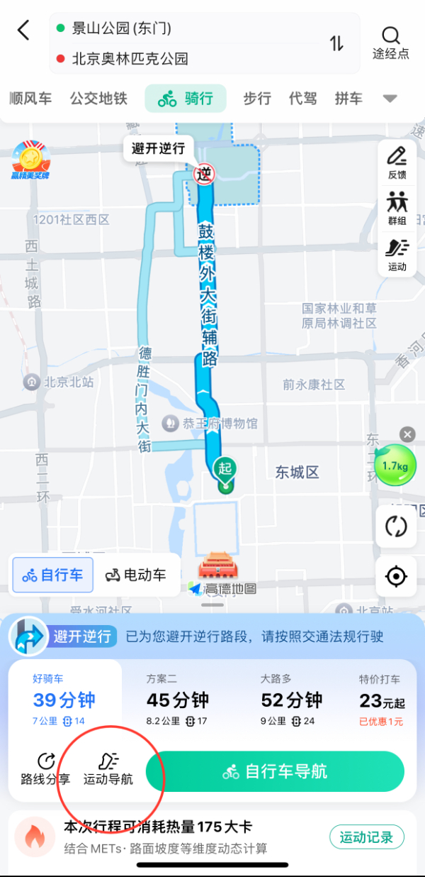 纵观全国,骑行已成为一种生活方式的选择,同时也兼具很强的健身功效。在高德地图上选取骑行地图的路线后,用户可以选择运动导航,在骑行前设置好目的地和路线,在骑行过程中,高德就会自动记录骑行路线、里程、速度、时长及卡路里消耗等详细数据,帮助用户更好地了解自己的骑行表现,为制定下一步的骑行计划提供有力依据。