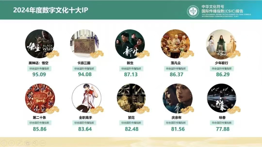 作为当代中国与世界研究院的品牌性研究成果,已连续两年在世界互联网大会分论坛发布,受到社会各界的广泛好评。基于不断优化的中华文化符号国际传播指数(CSIC)模型,报告今年首次构建了年度中华文化国际传播符号矩阵,覆盖古建艺术、古典神话、非物质文化遗产、古风仙侠、中华美食和人文自然景观六个关键维度。在综合考虑文化传播深度、文化创新性与适应性、文化影响力、受众反馈等因素的基础上,结合国际传播指数模型,报告提炼出“2024年度数字文化十大IP”,依次为《黑神话:悟空》《卡游三国》《新生》《落凡尘》《少年歌行》《第二十条》《全职高手》《繁花》《庆余年》和《咏春》,涵盖电影、电视剧、游戏、潮玩、网文、动漫、舞剧等多种数字文化传播载体。