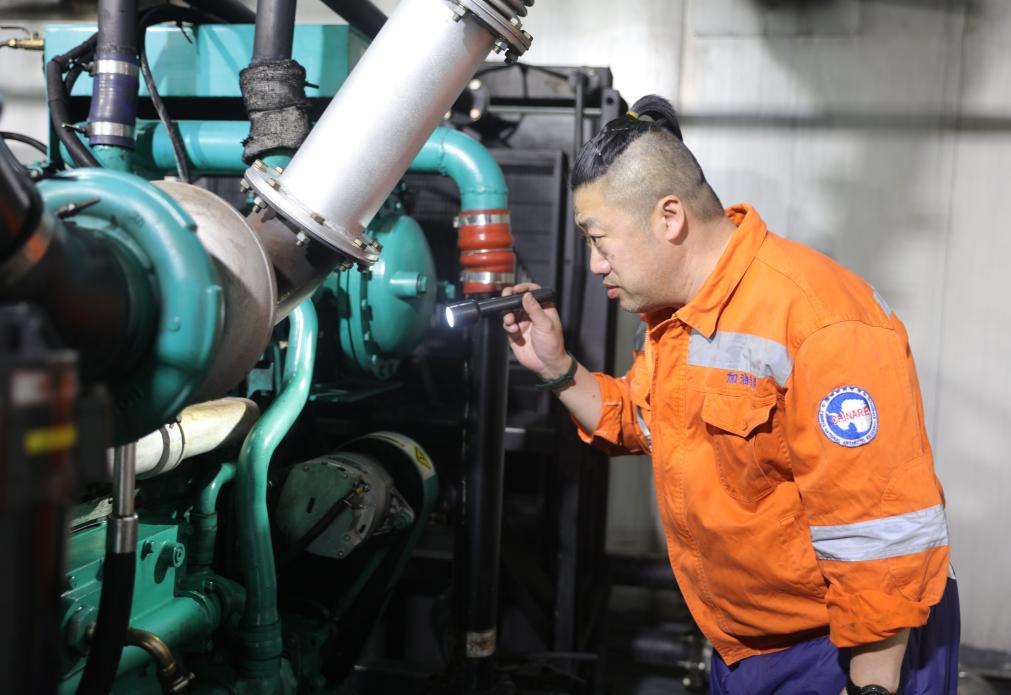 作为发电班班长,张冬的主要职责是确保柴油发电机组正常运转,为考察站输送稳定持续的电力。“发电栋24小时需要有人值守,我们三个人两班倒,每个班次12小时。”张冬说,“值班时每两小时巡查一次,检查发电机组是否有安全隐患。”