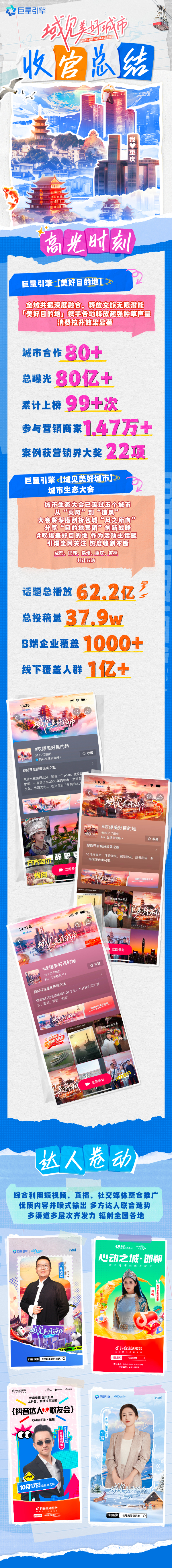 截至目前,活动主话题#吹爆美好目的地 总播放62.2亿,总投稿量37.9w。总曝光50亿+,覆盖1000+行业商家,线下覆盖人群1亿+。累计上榜热搜99+次。累计登顶榜单数据10+个。