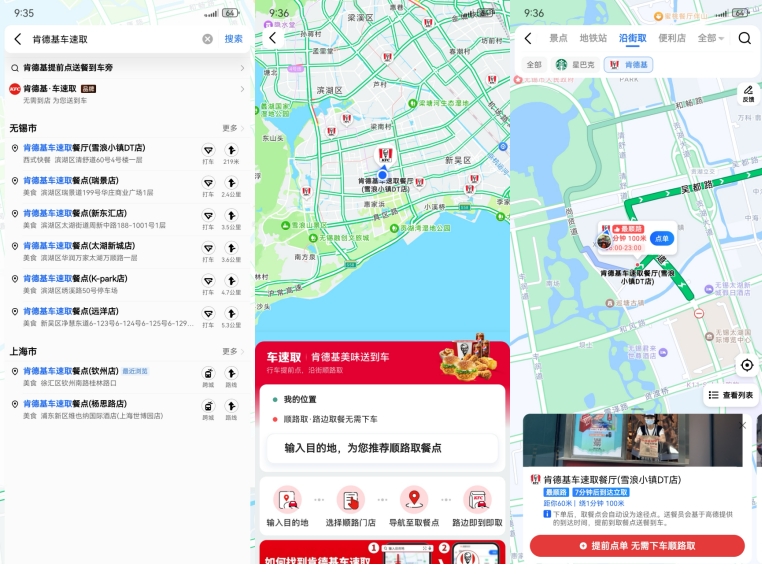 高德地图是目前唯一直接嵌入肯德基点餐系统的导航系统。用户只需在高德地图中搜索“肯德基车速取”即可将支持该服务的肯德基门店添加为行程中的途经点,并进行在线下单,当用户抵达餐厅附近的专属停车区时,无需下车,只需摇下车窗,便可轻松取餐,大大节省了有车一族在外出时找车位、排队取餐的时间成本,也为用户提供了一种全新的快速便捷用餐方式。