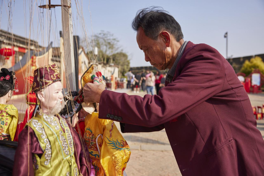 伴奏起,拨线,特色闽南语唱腔里,戴帽穿靴的木偶开始摇头晃脑,喜庆的团聚氛围溢出屏幕。在福建省漳州市漳浦县湖西乡,一场乡村春晚直播正在上演,学艺二十余年的“85后”戏曲主播@阿梅(丰归木偶戏)正在表演原创提线木偶戏《拜寿》。