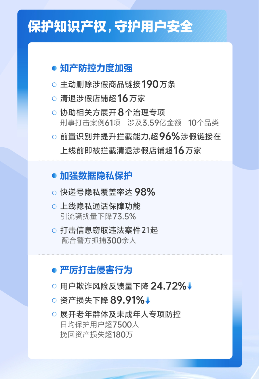 随着货架供给和内容形式日趋丰富多样,风险场景增多,平台持续加强对知识产权的保护,并严厉打击各种欺诈及破坏经营的行为,守护好用户及合作伙伴的信息安全。
