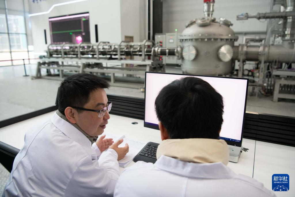 1月14日,在位于安徽省合肥市的聚变堆主机关键系统综合研究设施(CRAFT)园区内,科研人员在记录强流直线等离子体装置“赤霄”的运行状态。新华社记者 张端 摄