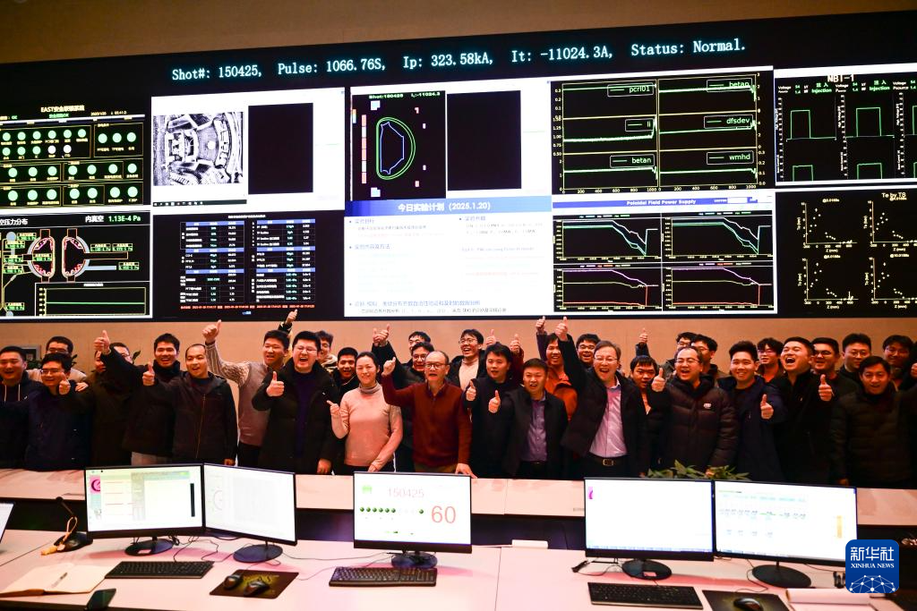 新华社合肥1月20日电(记者徐海涛、陈诺)“998、999、1000……”大屏幕上的数字最终定格在1066,原本安静的控制大厅一片欢呼。1月20日,我国有“人造太阳”之称的全超导托卡马克核聚变实验装置(EAST)在安徽合肥创造新世界纪录,首次完成1亿摄氏度1000秒“高质量燃烧”,标志我国聚变能源研究实现从基础科学向工程实践的重大跨越,对人类加快实现聚变发电具有重要意义。