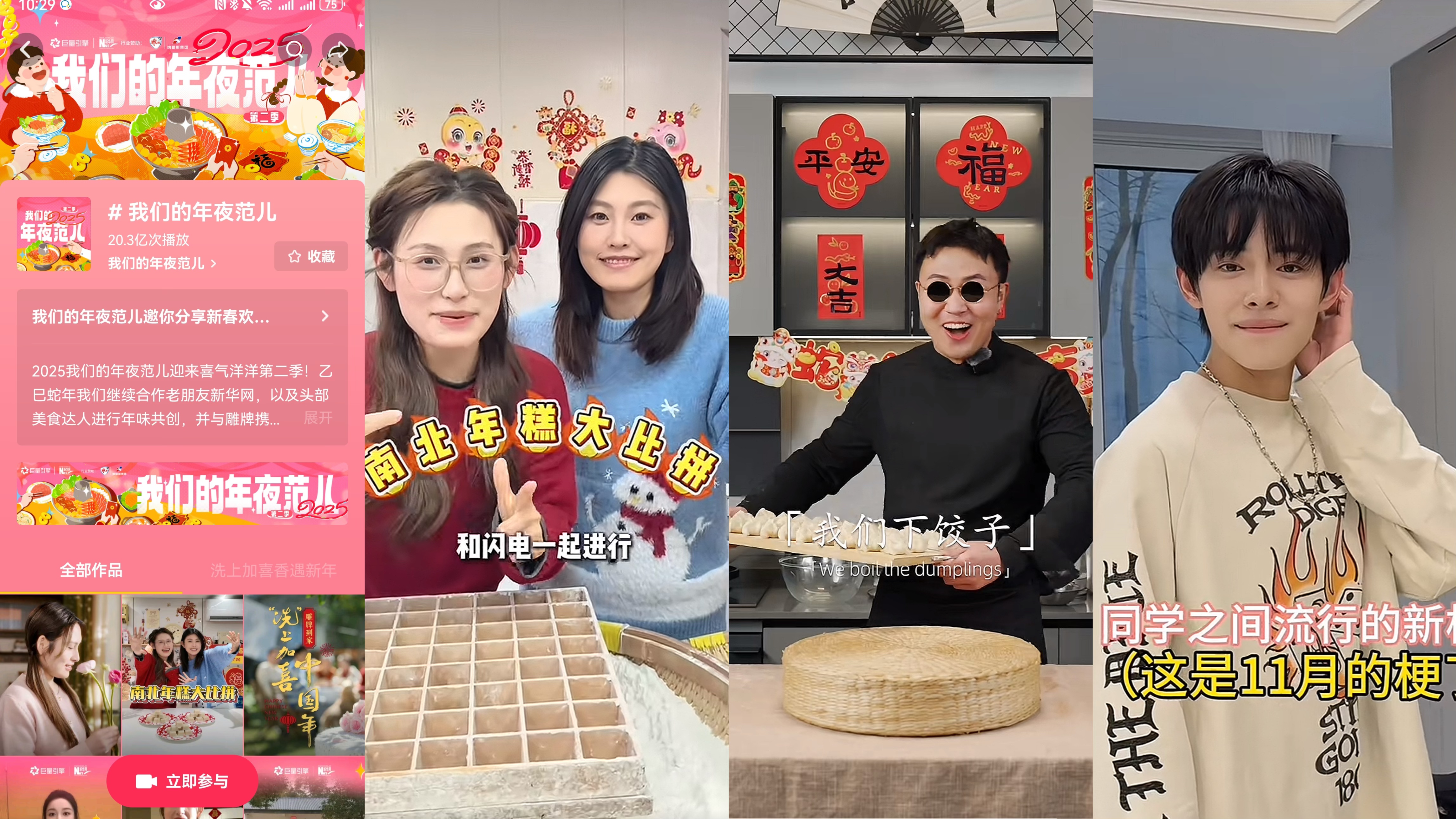 活动专属的热点话题#我们的年夜范儿在抖音一经上线便迅速升温,播放量超20.3亿。活动整合了丰富多样的核心视频与优质达人内容,成为展示活动魅力的重要窗口。抖音头部达人通过创意共创精心定制专属年夜范儿短片,@小小小海星与@哦吼小闪电共创的星图视频里,一场别开生面的南北年糕争霸赛激烈上演。@安秋金 独特的美食视角、@赵鹏皓和姐姐 的趣味生活分享、@Avacha 的动物园的趣味动物故事、@阿nic 的每一餐的精致美食制作、@潘姥姥 的采购年货等,这些短片从生活细微处着眼,从不同维度丰富了活动内涵,极大地增强了活动的吸引力与曝光度,让站内年夜氛围愈发浓厚热烈。更有姜贞羽、曹骏等明星大咖踊跃参与其中,通过短视频倾情分享各自独特的年夜范儿。明星达人们的内容创作深刻反映出当代年轻人在坚守传统习俗的同时,勇于探索新奇、追求品质生活的态度转变。