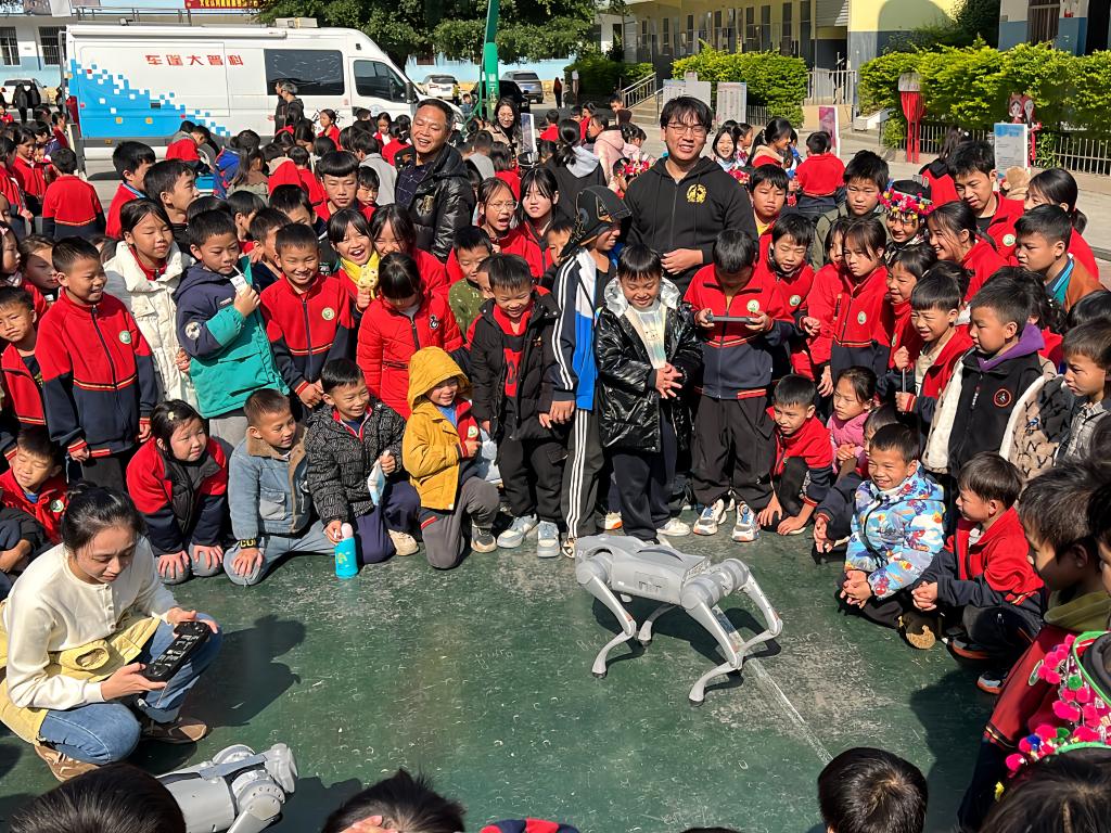 广西巴马瑶族自治县东山乡中心小学学生在体验和观看机器狗表演。新华社记者 温竞华 摄
