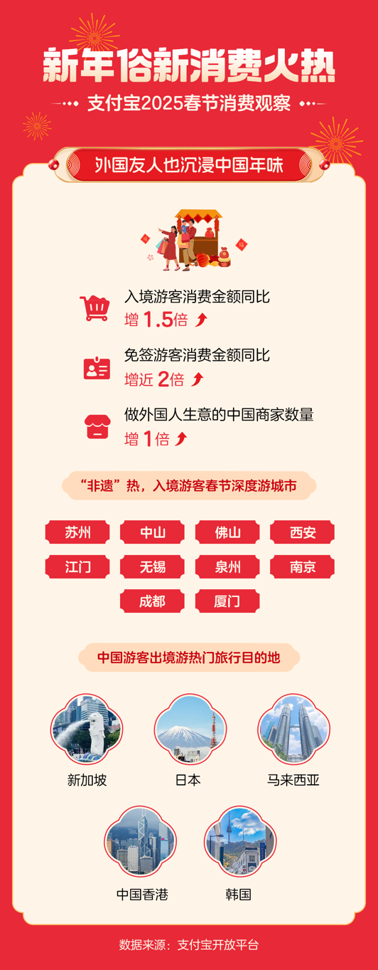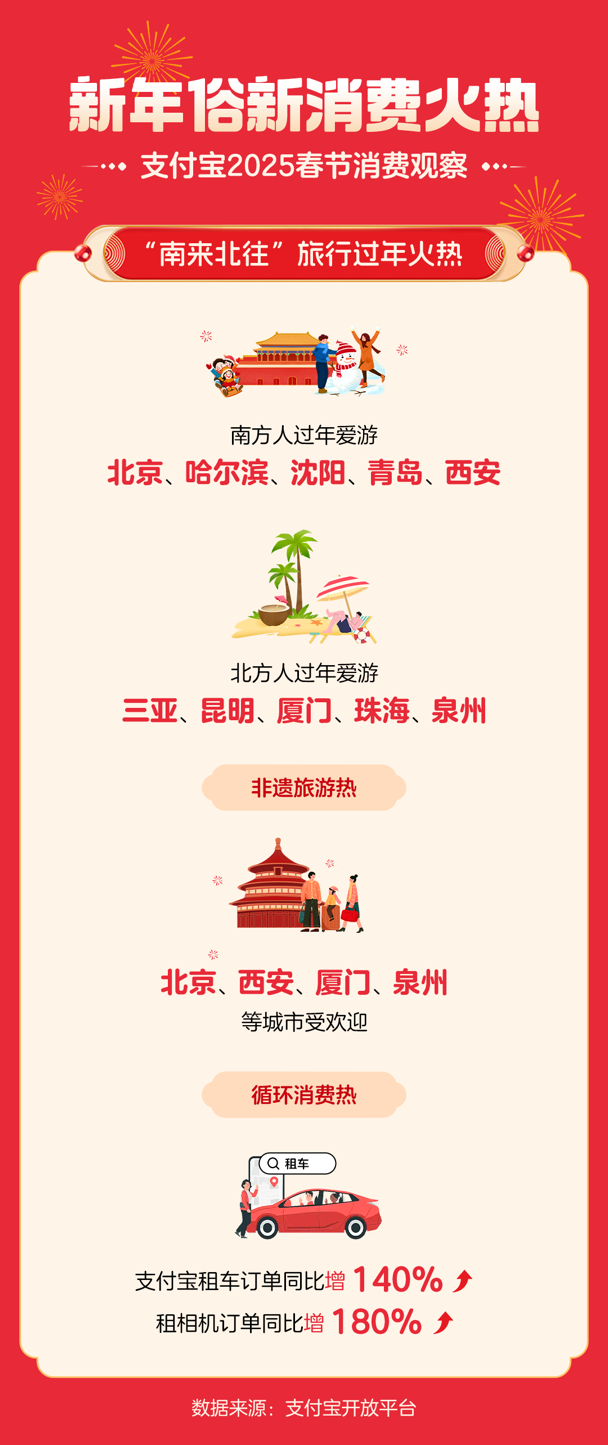 在春节成功申遗后的第一年,支付宝集福这一数字新年俗吸引了近6亿人参与;不少外国友人也在各地感受着中国浓浓的年味,赏美景品美食,消费热情高涨;“南来北往”旅游过年潮已然兴起,非遗体验、冰雪景点游、绿色循环消费等各种特色旅行方式层出不穷。
