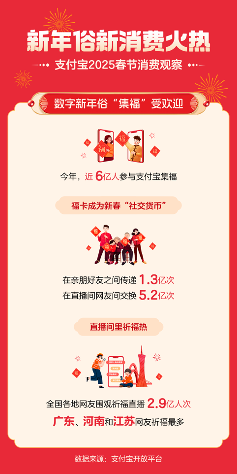 2025年,有近6亿人在支付宝参与集福,28套全新福卡成了广受欢迎的新春社交货币,福卡在亲朋好友之间传递1.3亿次,在直播间网友间交换 5.2 亿次。