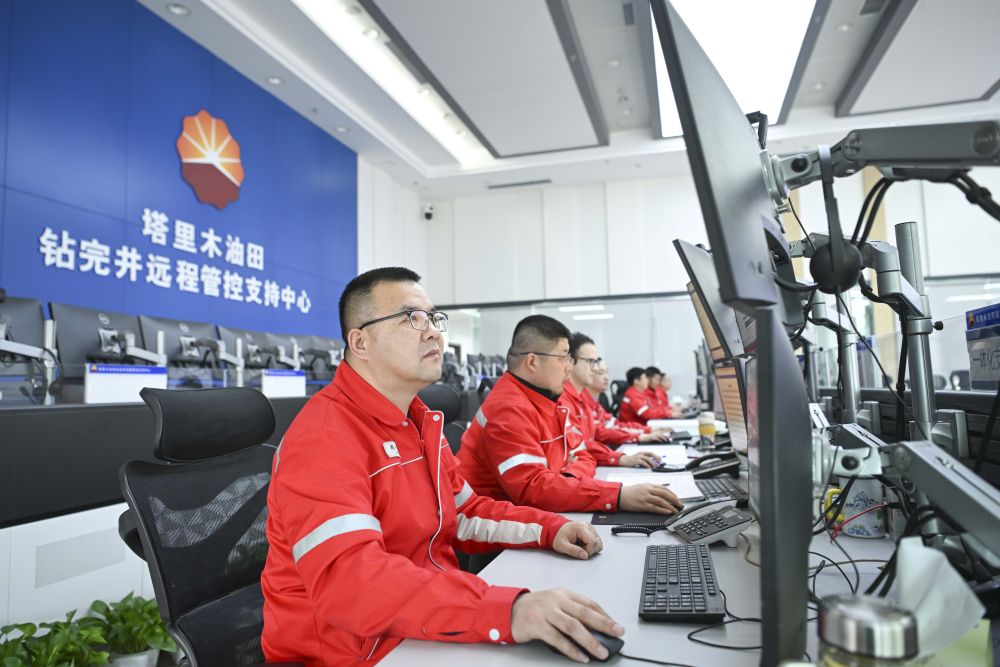 2025年2月18日,在位于新疆库尔勒市的塔里木油田钻完井远程管控支持中心,工作人员通过远程平台查看设备运行状态。新华社记者 胡虎虎 摄