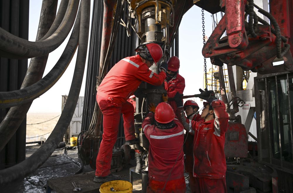 2025年2月19日,工人在中国石油塔里木油田深地塔科1井上施工。新华社记者 胡虎虎 摄