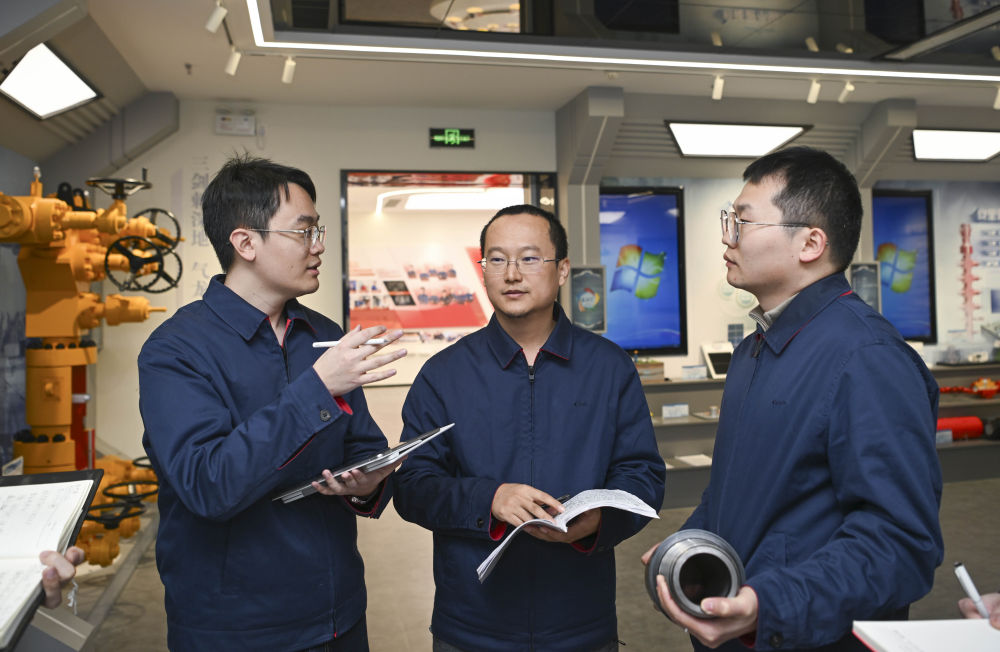 2025年2月18日,中国石油塔里木油田油气工艺研究院钻井项目部青年科研人员在一起交流。新华社记者 胡虎虎 摄