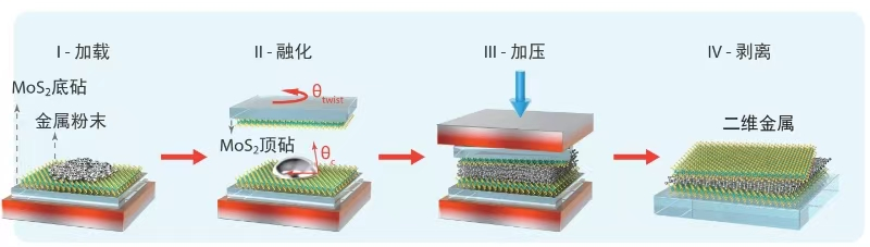 如何把金属材料也能做得这么薄呢?这在科学界极具挑战性。中国科学院物理研究所张广宇研究员带领团队发展了原子级制造的范德华挤压技术。这种技术采用的压砧是原子级平整、表面无悬挂键的材料。科研团队通过将金属熔化并利用团队前期制备的高质量单层二硫化钼范德华压砧挤压,实现了原子极限厚度下铋、锡、铅等二维金属的普适制备。二维金属的实现超越了当前二维范德华层状材料体系,补充了二维材料家族的一大块拼图。