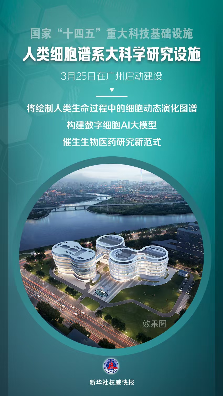 新华社广州3月25日电(记者马晓澄、钟焯)人类细胞谱系大科学研究设施25日在广州启动建设,将绘制人类生命过程中的细胞动态演化图谱,构建数字细胞AI大模型,催生生物医药研究新范式。