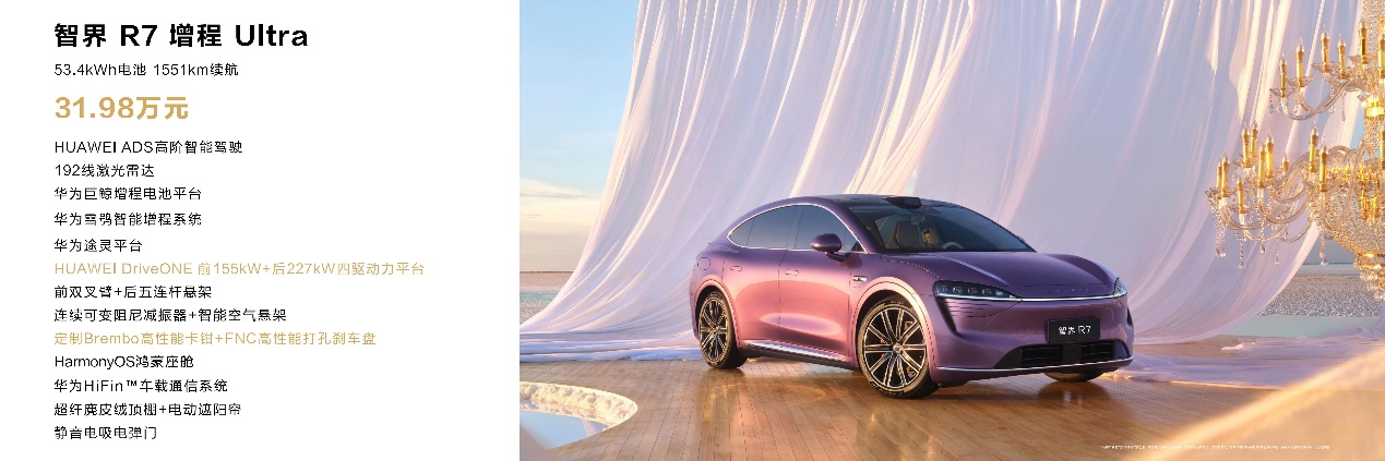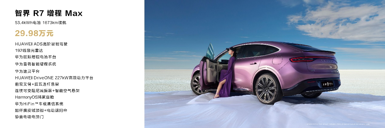 轿跑SUV智界R7推出增程新版本,在华为雪鸮智能增程系统极致静谧与低油耗优势基础上,带来53.4kWh大电池和四驱增程系统,满足用户对更高续航、更强性能的追求。其中,智界R7增程Max CLTC纯电续航达360km,城市纯电使用一周一充;满电满油CLTC综合续航可达1673km,WLTC百公里油耗低至5.68L,行驶里程更长,出行成本更低。智界R7增程Ultra搭载华为DriveONE四驱系统,零百加速仅需4.9秒,配合满血途灵平台拥有82.2km/h麋鹿测试成绩,提供极致操控的爽感和可油可电的便捷。