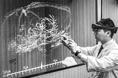 科研人员展示通过混合现实技术,微米级呈现脑机接口装置与大鼠大脑主要血管和脑组织的空间位置关系。 新华社记者 肖艺九 摄