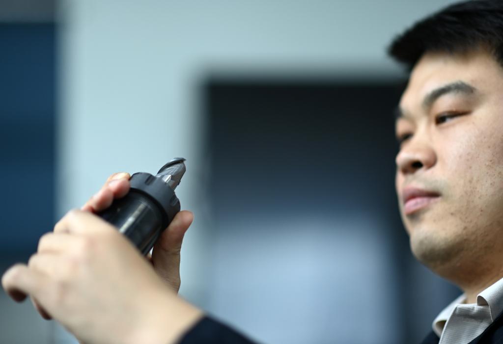 姚亚超在检查数控加工车间的刀头。新华社记者 赵子硕 摄