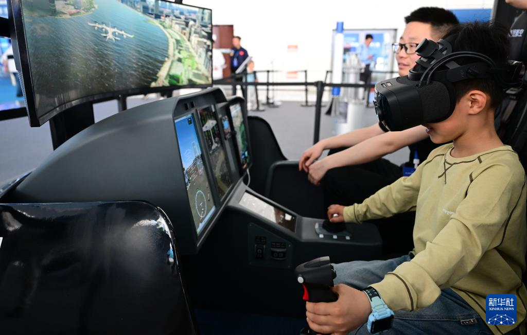 4月26日,小朋友在第三届中国(安徽)科技创新成果转化交易会上体验一款驾驶舱模拟器。