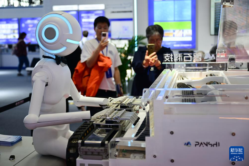 4月26日,观众在第三届中国(安徽)科技创新成果转化交易会上观赏一款弹钢琴的机器人。