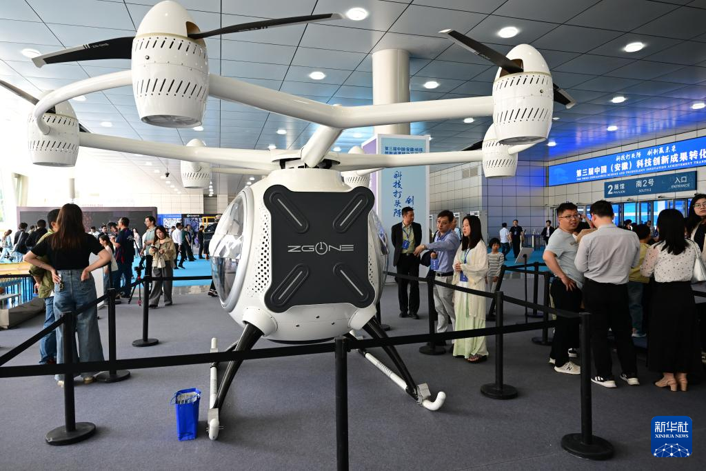 4月26日,观众在第三届中国(安徽)科技创新成果转化交易会上参观一款飞行器。