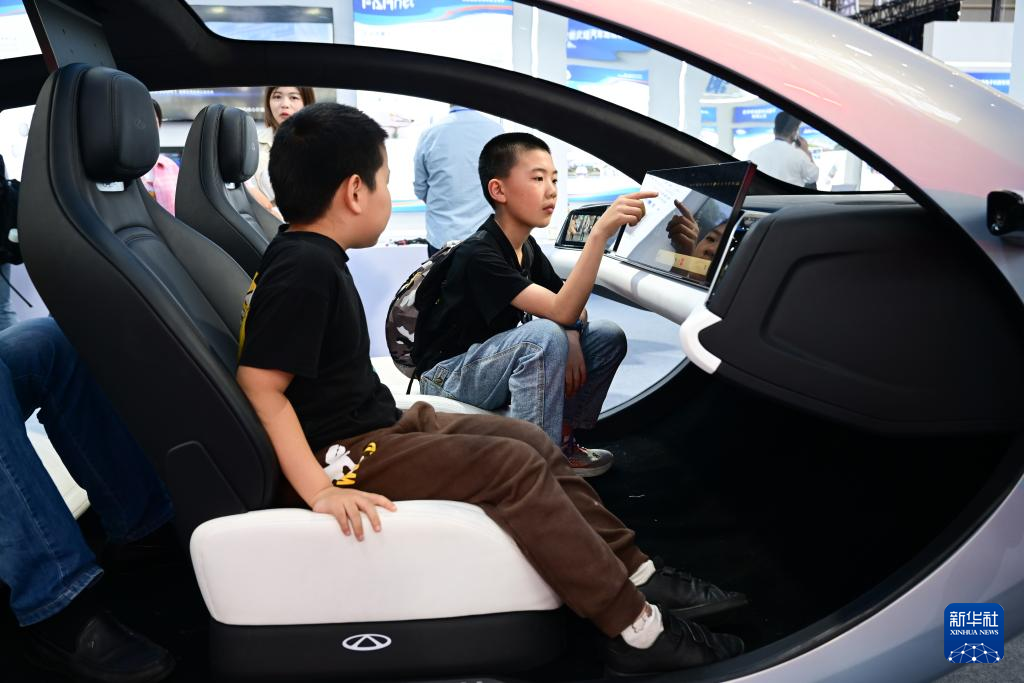 4月26日,小朋友们在第三届中国(安徽)科技创新成果转化交易会上体验一款智能座舱。