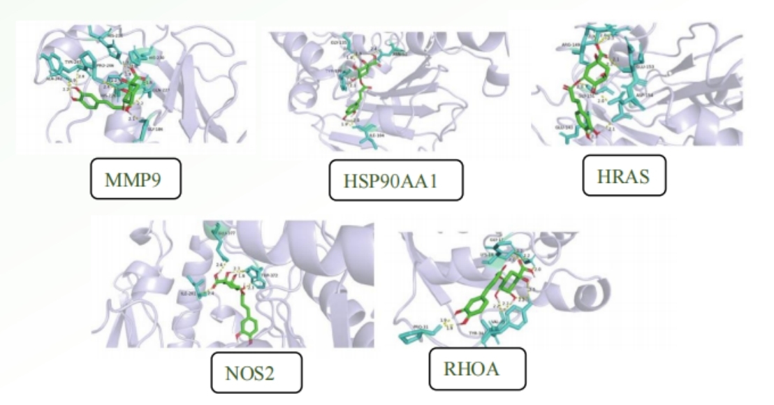 苦丁茶中主要有效成分与与特异性皮炎的核心靶蛋白MMP9、HSP9、0AA1、HRAS、NOS2和RHOA具有良好的分子对接结合性能